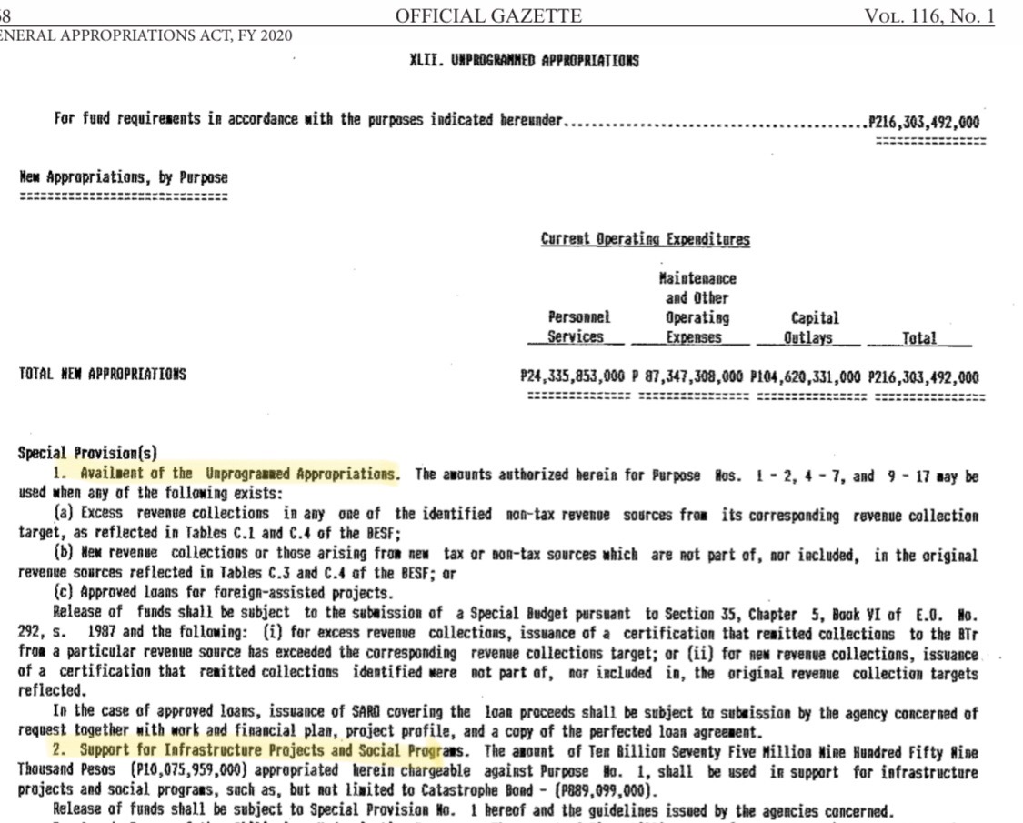 Based on the 2020 General Appropriations Act, a special provision in the Availment of the Unprogrammed Appropriations states that if an item in the non-tax revenues exceeds its target, this will trigger the release of the unprogrammed fund.