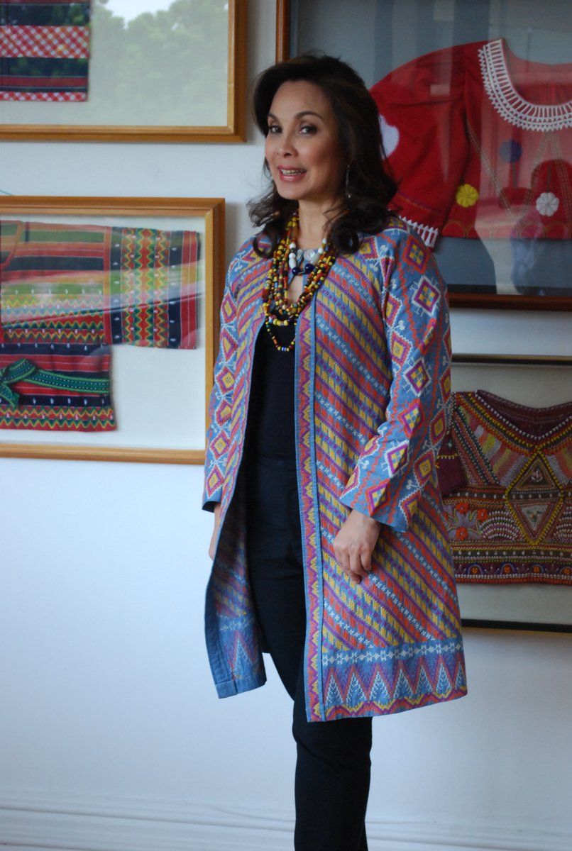 For the opening of the 17th Congress at the Senate in the morning, Senator Loren Legarda wears a cotton chambray coat with intricate embroidery of T’boli traditional patterns embroidered by T’bolis from Barangay Seloton, Lake Sebu, South Cotabato. She is also wearing shoes made from Marikina.